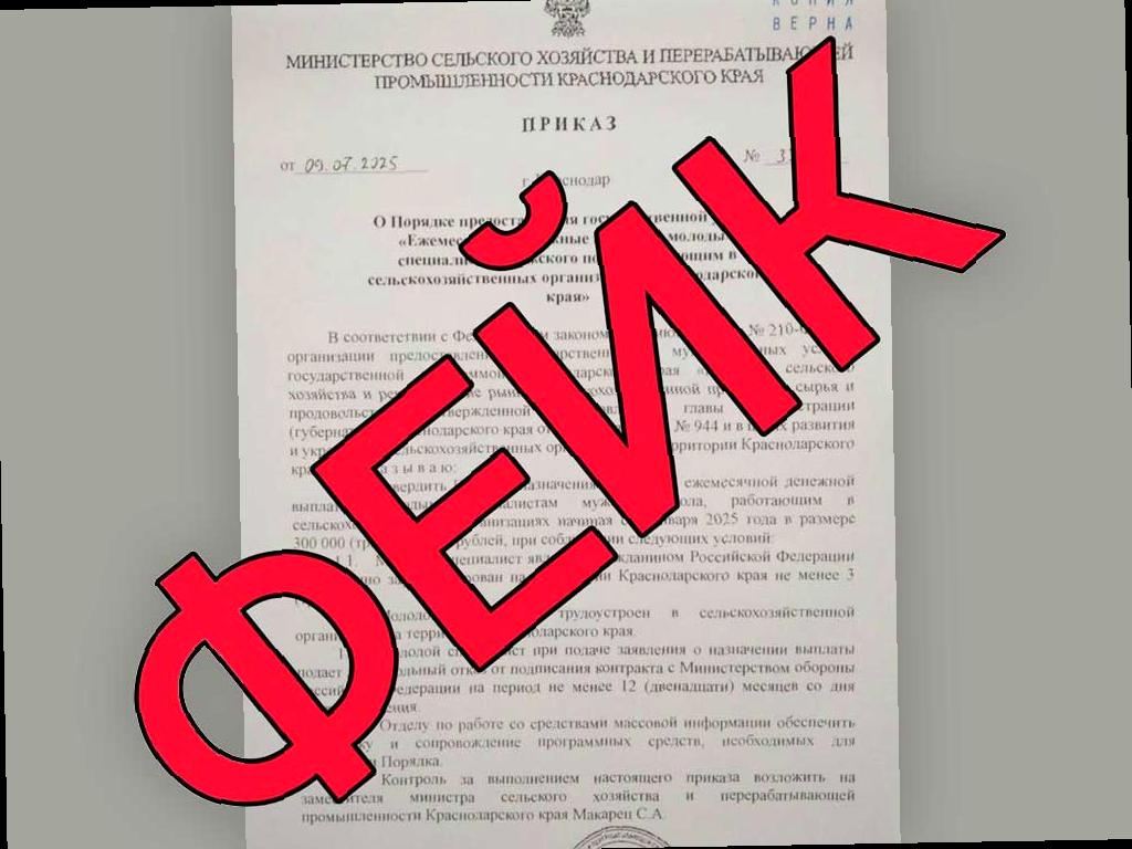 Кубанский оперштаб оповестил о фальшивом документе, который якобы отправлен из Минсельхоза региона. В письме говорится о выплатах специалистам за отказ от контракта с Минобороны РФ на год. Однако, оперштаб подтверждает, что это подделка, так как ведомство никогда не выпускало таких документов. В письме указаны несколько признаков подделки, таких как странная формулировка, некорректная ссылка на закон и отсутствие отдела по работе со СМИ в Минсельхозе. Ранее эксперты предупреждали о масштабных атаках мошенников с использованием фейкового агрегатора Госуслуг. Оригинал статьи доступен по ссылке: https://sochinews.io/2025/06/29/eksperty-predupredili-o-masshtabnoj-atake-moshennikov-s-1-iyulya-ispolzuyut-fejkovyj-agregator-gosuslug/. (Фото: Оперативный штаб Краснодарского края / t.me/opershtab23)