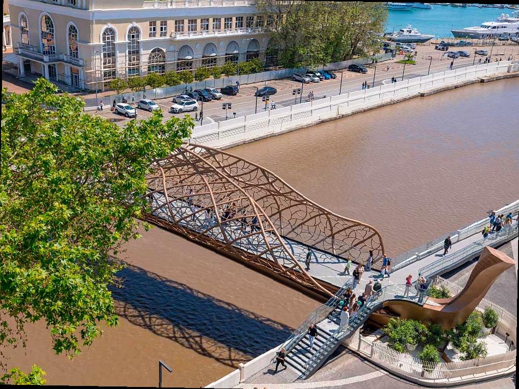 Мост длиной 50 метров был построен с применением экологически чистых технологий. Строители не затрагивали русло реки, чтобы не нарушить экосистему. Дизайн моста вдохновлен формой осеннего листа — стальные трубы изогнуты в нескольких плоскостях, повторяя идею 3D-художника.