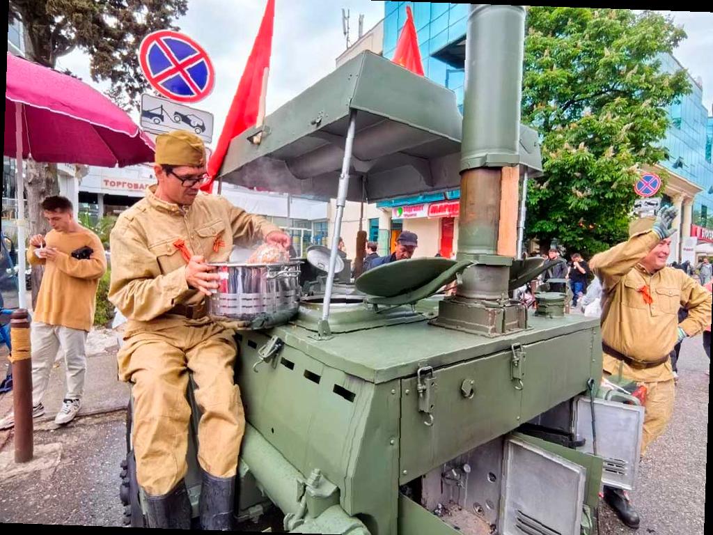 Исторические мобильные точки питания появились на различных праздничных площадках по всему курорту. В рамках акции «Солдатская каша» каждый желающий может попробовать гречневую кашу с тушенкой, приготовленную на полевой кухне.